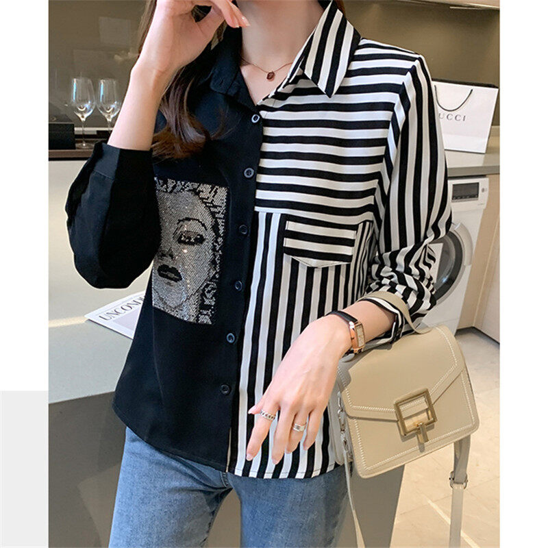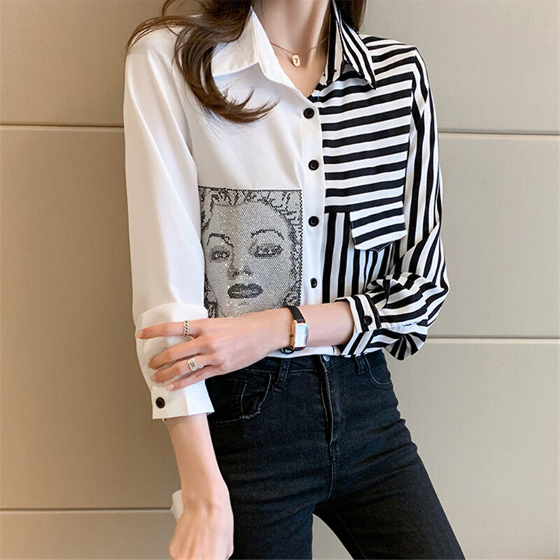 Loose Shirt Women Long Sleeve Fashion Blouse Printed Chiffon Polo Collar Korean Top Lady Clothes
